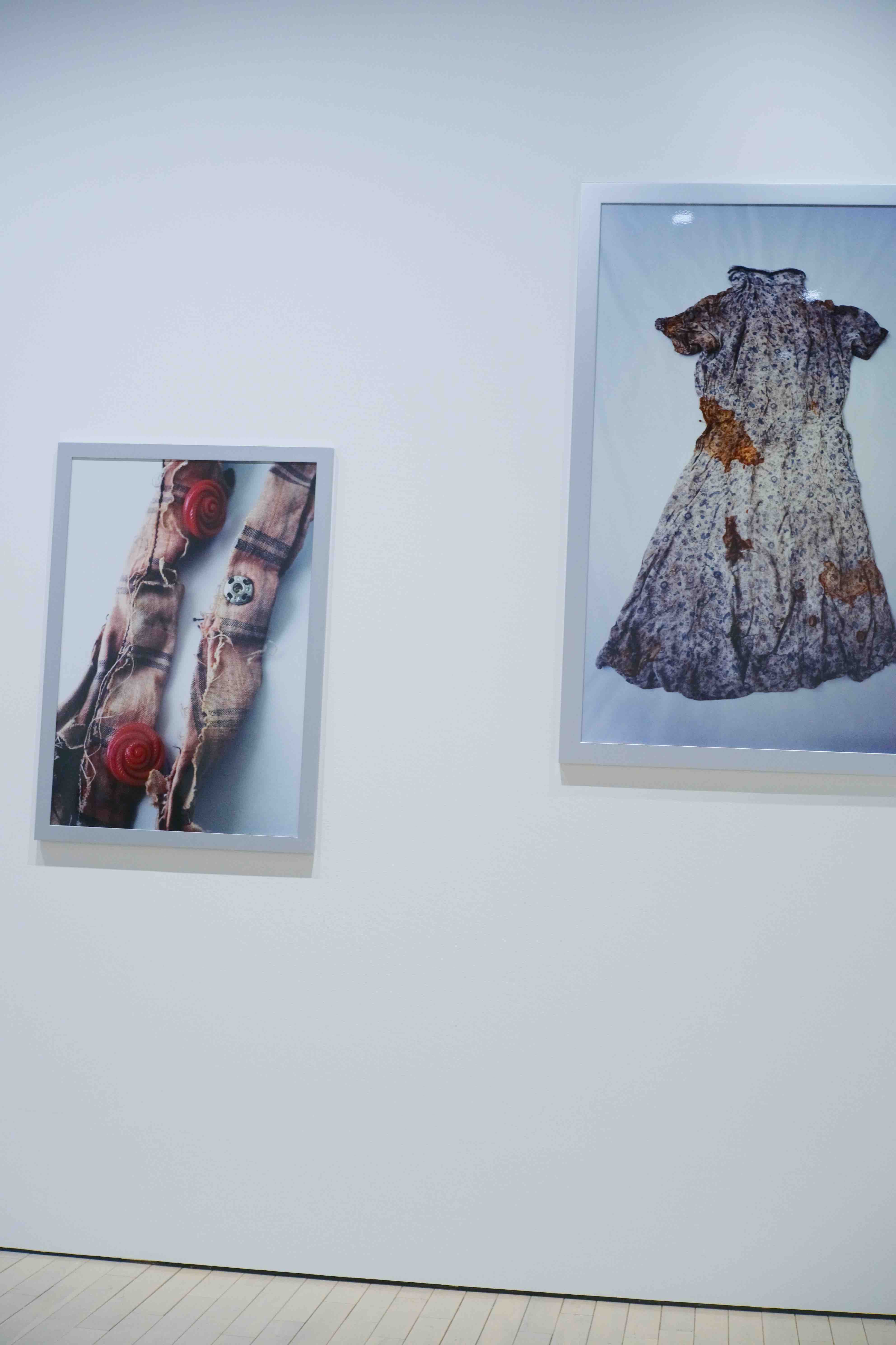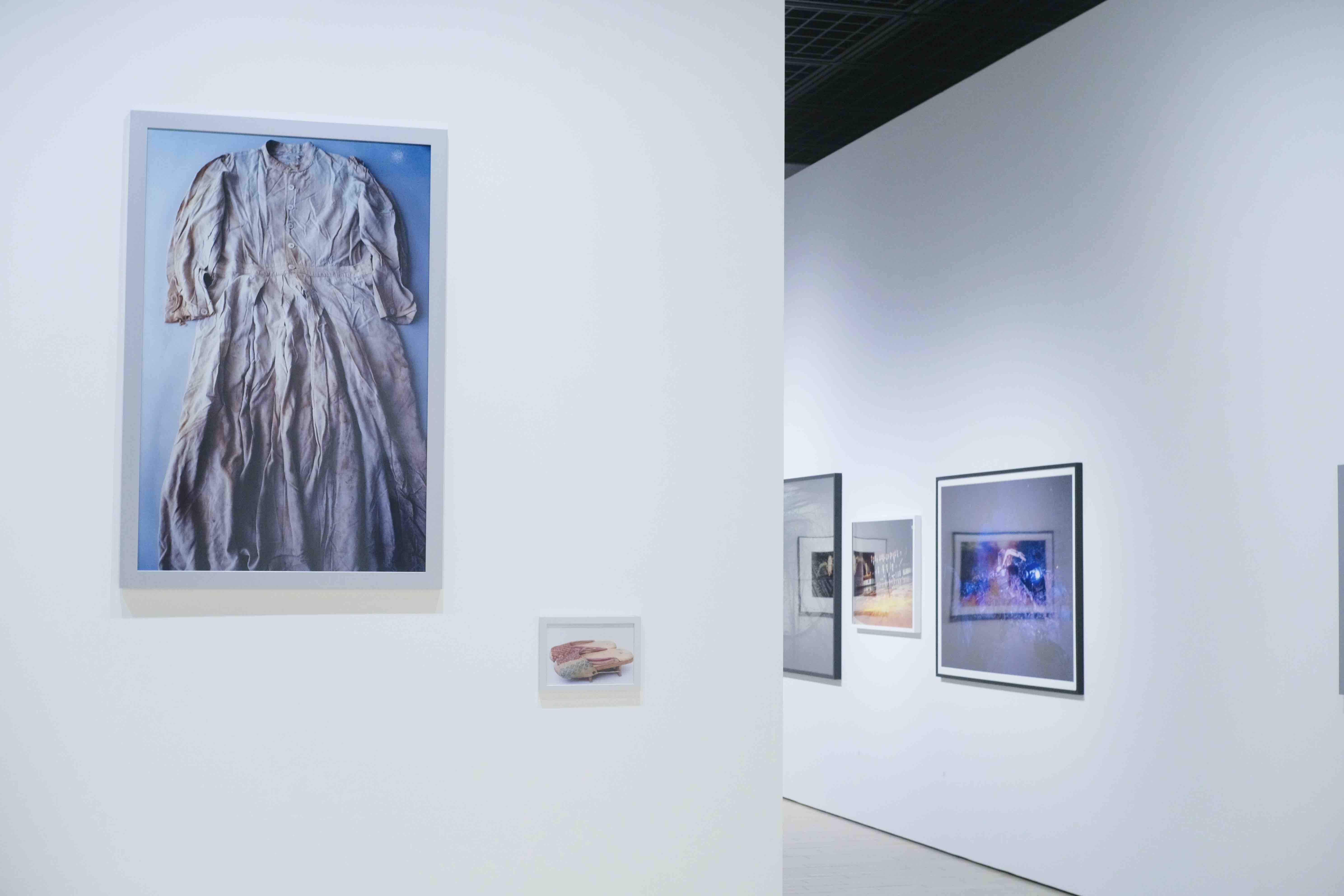 石内都は2007年から撮影を継続している「ひろしま」(2007-)の東京都写真美術館収蔵作品と最新作を。広島平和資料館に収蔵される被爆者の遺品。戦後80年が経ち、年々遺品の収蔵は少なくなっているというが、それでも遺族の箪笥の中で大切に保管されてきたものが現在でも寄贈されているという。かつて書籍の中で「眼の前にあるモノ達と共有している空気にピントを合わせ、その場の時間をたぐり寄せながらシャッターを押すだけだ。」(『ひろしま』集英社 2008)と書いていた石内。その言葉通り、そんな80年間大切にされてきた肌にまとってきた「モノ」に宿った記憶を石内は変わらず鮮やかに写し出す。